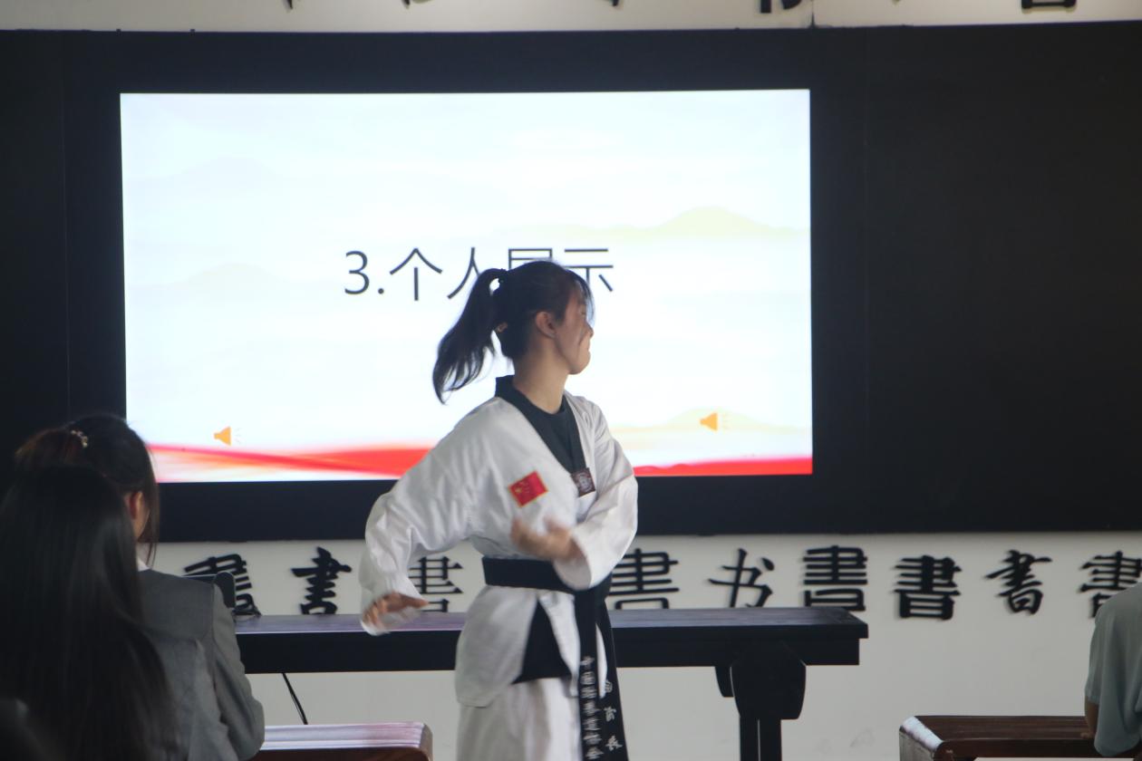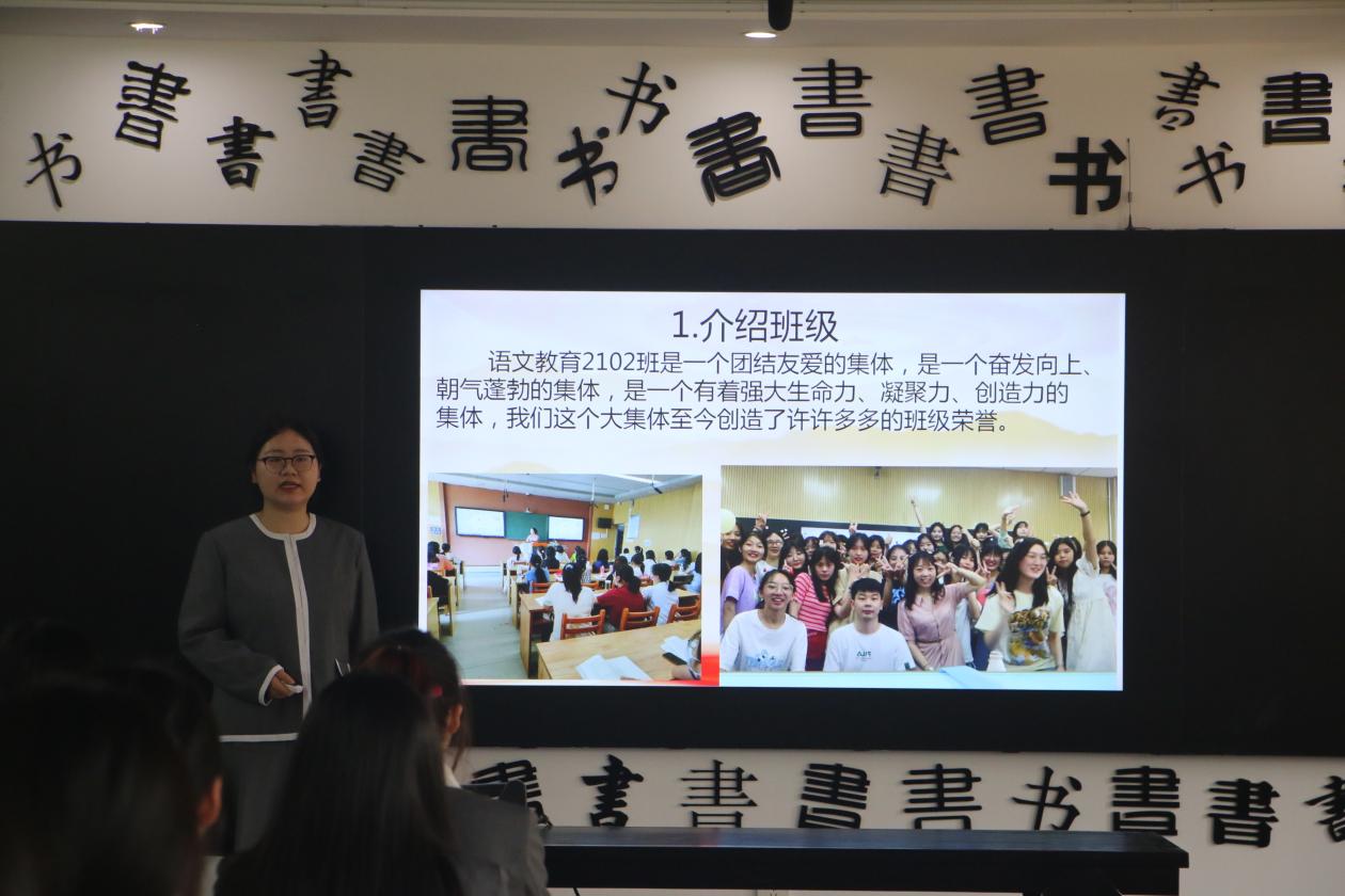 班会第二篇章感恩同学,首先由主持人为大家介绍语教2102班这个有爱的大家庭以及班级同学获得的荣誉。接着带领大家欣赏三笔一画作品展示以及个人展示环节,个人展示包括跆拳道和舞蹈欣赏。